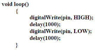 | ¿Qué hace la siguiente función? ¿Qué valor retorna? ¿Qué parámetros recibe? | Ejecuta cíclicamente estas instrucciones: * Sitúa en alto el pin "pin" * Ejecuta un retardo de 1000 ms (1s) * Sitúa en bajo el pin "pin" * Ejecuta un retardo de 1000 ms (1s) * Retorna a loop() y repite el proceso La función no devuelve valor alguno (tipo void) ni requiere parámetros para ejecutarse (paréntesis () vacíos). Se trata por tanto de una "función vacía". |