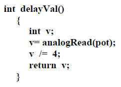 | La siguiente función lee un potenciómetro análogo conectado a una entrada de Arduino. ¿Qué hace cada instrucción? ¿Qué valor retorna? | "int v;" crea la variable temporal 'v' "v=analogRead(pot);" lee el valor de voltaje del potenciómetro, lo representa en formato de 10 bits (0:1023) y lo asigna a 'v' "v /=4" divide el valor previo de 'v' entre 4 y lo asigna a 'v', el cual queda ahora representado en formato de 8 bits (0:255) "return v;" devuelve el valor final de 'v' La función devuelve el número entero "delayVal()", correspondiente al valor de la variable local 'v' |