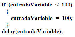 | ¿Qué hace el siguiente conjunto de instrucciones? | Este código prueba si la variable 'entradaVariable' es menor de 100. En caso afirmativo. le reasigna el valor '100' y ejecuta a continuación un retardo en milisegundos equivalente al valor actual de la variable. De lo contrario la deja como está y solo ejecuta el retardo. |
