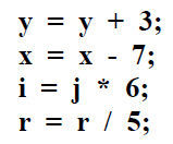 | ¿Qué hacen las siguientes instrucciones aritméticas? | "y=y+3;" suma '3' al valor actual de 'y' y recarga 'y' con el nuevo resultado. "x=x-7;" resta '7' del valor actual de 'x' y recarga 'x' con el nuevo resultado. "i=j*6;" multiplica por 6 el valor actual de "j" y carga el resultado en "i". "r=r/5";" divide entre 5 el valor actual de 'r' y recarga 'r' con el nuevo resultado. |