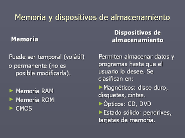 | Componentes de almacenamiento los dispositivos de almacenamiento del computador, se almacenan en forma temporal o permanentemente los programas y datos que son manejados por las aplicaciones que se ejecutan en estos sistemas. | |