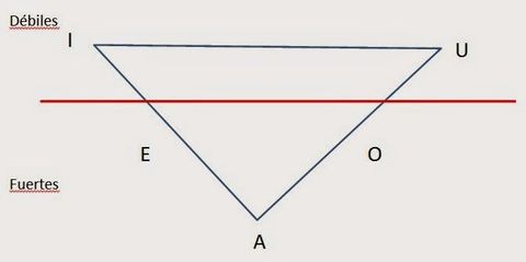 | Una vocal débil ó cerrada es una vocal que puede formar diptongos cuando es átona y adyacente a una vocal fuerte y estas son la /i, u/. | Por otro lado, la fuerte o abierta es una vocal que fonológicamente sólo puede hacer de núcleo silábico. Fonéticamente tienen un grado de abertura mayor /a, e, o/. |