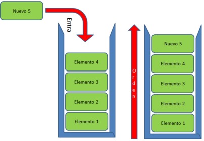 | Cola: Es una estructura de datos caracterizada por ser una secuencia de elementos en la que la operación de inserción push se realiza en un extremo y la operación de extracción pop por el otro, también se le llama operación FIFO. | |