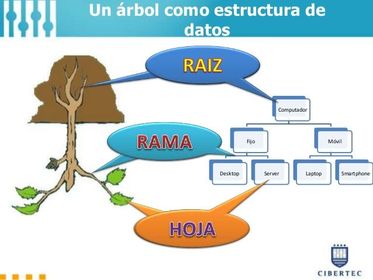 | Árbol: Un árbol es una estructura no lineal en la que cada nodo puede apuntar a uno o varios nodos. También se suele dar una definición recursiva: un árbol es una estructura en compuesta por un dato y varios árboles. Nodo hijo: cualquiera de los nodos apuntados por uno de los nodos del árbol. Nodo padre: nodo que contiene un puntero al nodo actual. Nodo raíz: nodo que no tiene padre. Este es el nodo que usaremos para referirnos al árbol. Nodo hoja: nodo que no tiene hijos. Nodo rama: aunque esta definición apenas la usaremos, estos son los nodos que no pertenecen a ninguna de las dos categorías anteriores. |