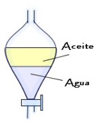 | Embudo de separación Es un elemento de vidrio que se puede encontrar en los laboratorios, y que se emplea para separar dos líquidos inmiscibles. En la parte superior presenta una embocadura taponable por la que se procede a cargar su interior. En la parte inferior posee un grifo de cierre o llave de paso que permite regular o cortar el flujo de líquido a través del tubo que posee en su extremo más bajo. | |