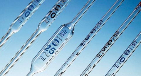 | Pipeta graduada Las pipetas permiten la transferencia de un volumen generalmente no mayor a 20 ml de un recipiente a otro de forma exacta. este permite medir alícuotas de líquido con bastante precisión. Suelen ser de vidrio | |