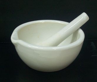 | Mortero con pistilo el mortero es un recipiente y el pistilo un maso (especie de martillo), ambos de porcelana, y se usa para pulverizar materiales en él. | |