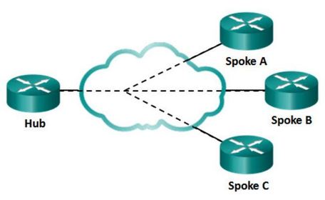 | WAN Topologies - Hub-and-Spoke If a private network connection between multiple sites is required, then a point-to-point topology with multiple point-to-point circuits is one option. Each point-to-point circuit requires its own dedicated hardware interface which will require multiple routers with multiple WAN interface cards. This can be expensive. A less expensive option is a point-to-multipoint topology (Figure), also known as a hub and spoke topology. With a hub-and-spoke topology a single interface to the hub can be shared by all spoke circuits. For example, spoke sites can be interconnected through the hub site using virtual circuits and routed subinterfaces at the hub. A hub-and-spoke topology is also an example of a single-homed topology. | |