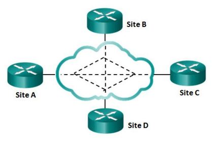 | WAN Topologies - Full Mesh One of the disadvantages of hub-and-spoke topologies is that all communication has to go through the hub. With a full mesh topology (Figure ) using virtual circuits, any site can communicate directly with any other site. The disadvantage here is the large number of virtual circuits that need to be configured and maintained. | |