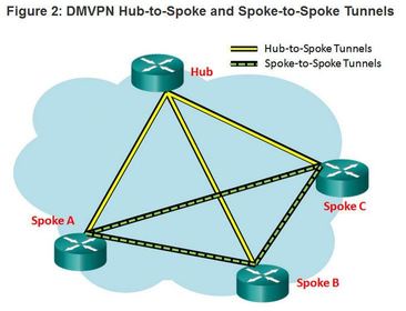 | DMVPN is built using the following technologies: 1. Next Hop Resolution ProtocolNHRP is a Layer 2 resolution and caching protocol similar to Address Resolution Protocol (ARP). NHRP creates a distributed mapping database of public IP addresses for all tunnel spokes. NHRP is a client server protocol consisting of the NHRP hub known as the Next Hop Server (NHS), and the NHRP spokes known as the Next Hop Clients (NHC). | 2. Generic Routing Encapsulation (GRE) is a tunneling protocol developed by Cisco that can encapsulate a wide variety of protocol packet types inside IP tunnels. An mGRE tunnel interface allows a single GRE interface to support multiple IPsec tunnels. With mGRE, dynamically allocated tunnels are created through a permanent tunnel source at the hub and dynamically allocated tunnel destinations, created as necessary, at the spokes. This reduces the size and simplifies the complexity of the configuration. 3. Like other VPN types, DMVPN relies on IPsec to provide secure transport of private information over public networks, such as the Internet. |