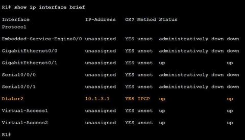| PPPoE Verification Commands Ej: ? command is issued on R1 to verify the IPv4 address automatically assigned to the dialer interface by the ISP router. the customer’s router is connected to the ISP router using DSL. Both routers have been configured for PPPoE. | |