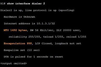 | PPPoE Verification Commands Ej: ? command on R1, verifies the MTU and PPP encapsulation configured on the dialer interface. | |