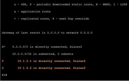 | PPPoE Verification Commands Ej: show ip route Notice that two /32 host routes for 10.0.0.0 have been installed in R1’s routing table. The first host route is for the address assigned to the dialer interface. The second host route is the IPv4 address of the ISP. The installation of these two host routes is the default behavior for PPPoE. | |