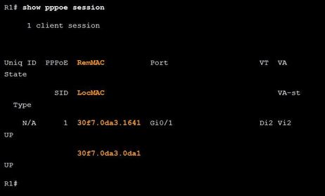 | PPPoE Verification Commands Ej: ? command is used to display information about currently active PPPoE sessions. The output displays the local and remote Ethernet MAC addresses of both routers. The Ethernet MAC addresses can be verified by using the show interfaces command on each router. | |