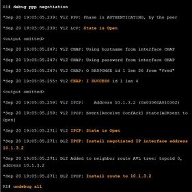 | PPPoE Negotiation Ej: ? Verify PPP negotiation, it displays part of the debug output after R1’s G0/1 interface has been enabled. There are four main points of failure in a PPP negotiation: - No response from the remote device (the ISP) - Link Control Protocol (LCP) not open - Authentication failure - IP Control Protocol (IPCP) failure | |