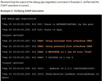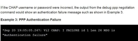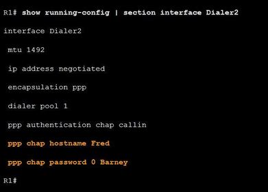 | PPPoE Authentication Ej: ? After confirming with the ISP that they use CHAP, verify that the CHAP username and password are correct. Example shows the CHAP configuration on the dialer2 interface. | |