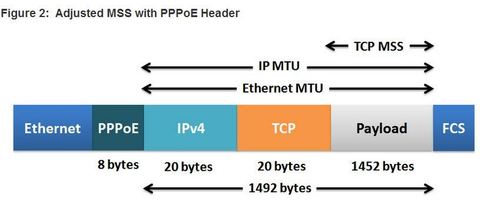 | PPPoE MTU Size Accessing some web pages might be a problem with PPPoE. When the client requests a web page, a TCP 3-way handshake occurs between the client and the web server. During the negotiation, the client specifies the value of its TCP maximum segment size (MSS). The TCP MSS is the maximum size of the data portion in the TCP segment. ** A host determines the value of its MSS field by subtracting the IP and TCP headers from the Ethernet maximum transmission unit (MTU). On an Ethernet interface, the default MTU is 1500 bytes. Subtracting the IPv4 header of 20 bytes and the TCP header of 20 bytes, the default MSS size will be 1460 bytes | |