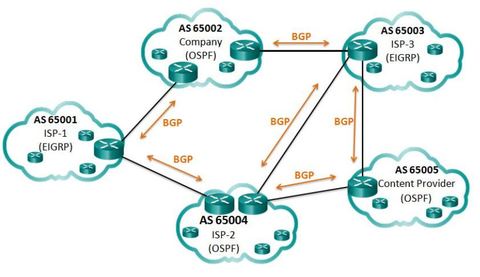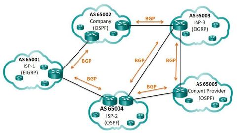 | IGP and EGP Routing Protocols Internal routing protocols use a specific metric, such as OSPF’s cost, for determining the best paths to destination networks. BGP does not use a single metric like IGPs. BGP routers exchange several path attributes including a list of AS numbers (hop by hop) necessary to reach a destination network. Ej: AS 65002 may use the AS-path of 65003 and 65005 to reach a network within the content provider AS 65005. ** BGP is known as a path vector routing protocol. Note: AS-path is one of several attributes that may be used by BGP to determine best path. | |