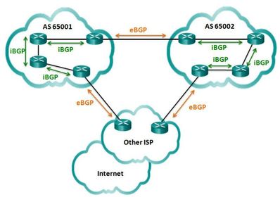 | eBGP and iBGP Two routers exchanging BGP routing information are known as BGP peers there are two types of BGP: - External BGP (eBGP) – External BGP is the routing protocol used between routers in different autonomous systems. - Internal BGP (iBGP) - Internal BGP is the routing protocol used between routers in the same AS. Note: There are some differences in how BGP operates depending on whether the two routers are eBGP peers or iBGP peers | |