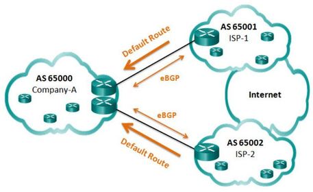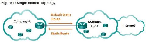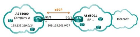 | BGP Sample Configuration Using eBGP, Company-A in AS 65000 will advertise its 198.133.219.0/24 network to ISP-1 at AS 65001. ISP-1 will advertise a default route in its eBGP updates to Company-A. Note: BGP is usually not necessary in single-homed AS. It is used here to provide a simple configuration example. | |