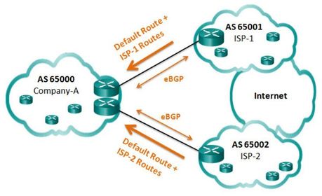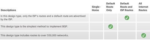 | BGP Options 1. Default Route Only ISPs advertise a default route to Company-A,The arrows indicate that the default is configured on the ISPs, not on the Company-A. ** This is the simplest method to implement BGP. However, because the company only receives a default route from both ISPs, sub-optimal routing may occur. For example, Company-A may choose to use ISP-1’s default route when sending packets to a destination network in ISP-2’s AS. | |