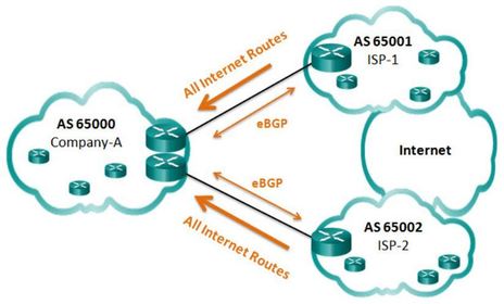 | BGP Options 3. All Internet Routes ISPs advertise all Internet routes to Company-A Because Company-A receives all Internet routes from both ISPs, Company-A can determine which ISP to use as the best path to forward traffic for any network. Although this solves the issue of sub-optimal routing, the Company-A’s BGP router must contain all Internet routes, which would currently include routes to over 550,000 networks. | |