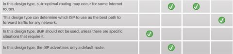 | BGP Options 2. Default Route and ISP Routes ISPs advertise their default route and their network to Company-AThis option allows Company-A to forward traffic to the appropriate ISP for networks advertised by that ISP. For example, Company-A would choose ISP-1 for networks advertised by ISP-1. For all other networks, one of the two default routes can be used, which means sub-optimal routing may still occur for all other Internet routes. | |