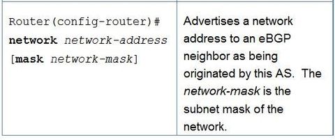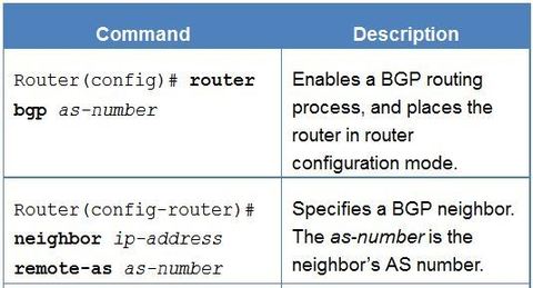 | To implement eBGP for this course, you will need to complete the following tasks: | Step 1: Enable BGP routing. Step 2: Configure BGP neighbor(s) (peering). Step 3: Advertise network(s) originating from this AS. |
