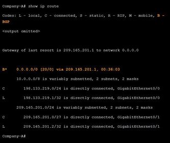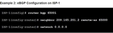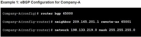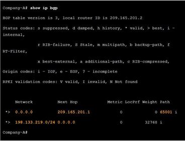 | Verify eBGP Ej: ? Verify that received and advertised IPv4 networks are in the BGP table. The first entry 0.0.0.0 with a next hop of 209.165.201.1 is the default route advertised by ISP-1. The AS path displays the single AS of 65001 because the 0.0.0.0/0 network advertised by ISP-1, originated from the same AS. Most BGP table entries show multiple autonomous system numbers in the path, listing the sequence of AS numbers required to reach the destination network. The second entry 198.133.219.0/24 is the network advertised by the Company-A router to ISP-1. The next hop address of 0.0.0.0 indicates that the 198.133.219.0/24 network originated from this router. | |
