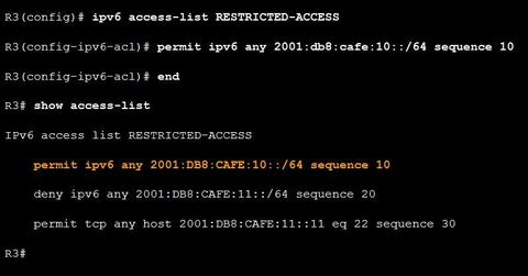 | Troubleshooting IPv6 ACL - Scenario 2 The first permit statement should allow access to the :10 network. However, the administrator configured a host statement and did not specify a prefix. In this case, only access to the 2001:DB8:CAFE:10:: host is allowed. Ej: To correct this issue, remove the host argument and change the prefix to /64. You can do this without removing the ACL by replacing the ACE using the sequence number 10 | |