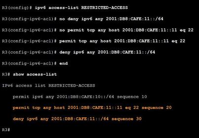 | Troubleshooting IPv6 ACL - Scenario 2 The second error in the ACL is the order of the next two statements. The policy specifies that hosts on the R3 LAN should be able to SSH into host 2001:DB8:CAFE:11::11. However, the deny statement for :11 network is listed before the permit statement. Therefore, all attempts to access the :11 network are denied before the statement permitting SSH access can be evaluated. After a match is made, no further statements are analyzed. Ej: To correct this issue, you will need to remove the statements first, and then enter them in the correct order | |