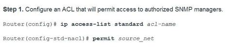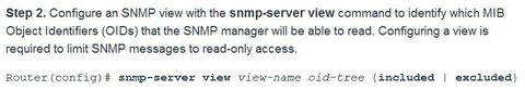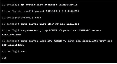 | SNMPv3 Configuration Steps EJ: a standard ACL named PERMIT-ADMIN is configured to permit only the 192.168.1.0/24 network. All hosts attached to this network will be allowed to access the SNMP agent running on R1. An SNMP view is named SNMP-RO and is configured to include the entire iso tree from the MIB. On a production network, the network administrator would probably configure this view to include only the MIB OIDs that were necessary for monitoring and managing the network. | |