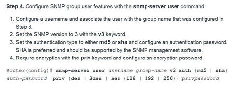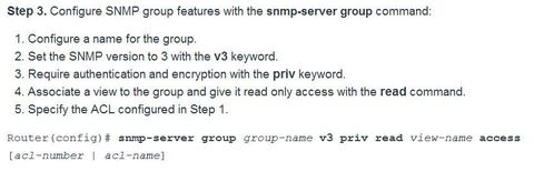 | SNMPv3 Configuration Steps EJ: An SNMP group is configured with the name ADMIN. SNMP is set to version 3 with authentication and encryption required. The group is allowed read-only access to the view (SNMP-RO). Access for the group is limited by the PERMIT-ADMIN ACL. An SNMP user, BOB, is configured as a member of the group ADMIN. SNMP is set to version 3. Authentication is set to use SHA, and an authentication password is configured. Although R1 supports up to AES 256 encryption, the SNMP management software only supports AES 128. Therefore, the encryption is set to AES 128 and an encryption password is configured. | |
