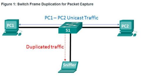 | Port Mirroring What if a network administrator wanted to capture packets from many other key devices and not just the local NIC? The basic operation of a modern switched network disables the packet analyzer ability to capture traffic from other sources. For instance, a user running Wireshark can only capture traffic going to their NIC. They cannot capture traffic between another host and a server. ** The solution to this dilemma is to enable port mirroring. The port mirroring feature allows a switch to copy and send Ethernet frames from specific ports to the destination port connected to a packet analyzer | |