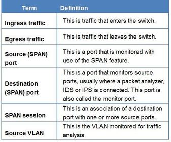 | Local SPAN The SPAN feature is said to be local when the monitored ports are all located on the same switch as the destination port. This feature is in contrast to Remote SPAN (RSPAN). ** There are three important things to consider when configuring SPAN: | 1. The destination port cannot be a source port, and the source port cannot be a destination port. 2. The number of destination ports is platform-dependent. Some platforms allow for more than one destination port. 3. The destination port is no longer a normal switch port. Only monitored traffic passes through that port. |