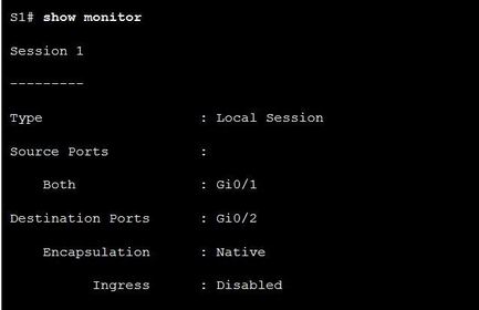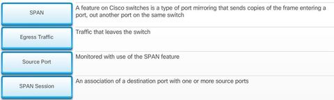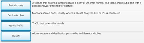 | Local SPAN ** The Switched Port Analyzer (SPAN) feature on Cisco switches is a type of port mirroring that sends copies of the frame entering a port, out another port on the same switch. ** It is common to find a device running a packet analyzer, an Intrusion Detection System (IDS), or an Intrusion Prevention System (IPS) connected to that port. | |