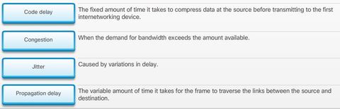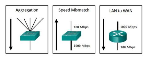 | Bandwidth, Congestion, Delay, and Jitter Network congestion causes delay. Variations in delay cause jitter. An interface experiences congestion when it is presented with more traffic than it can handle. ** Network congestion points are strong candidates for QoS mechanisms Note: A device only implements QoS when it is experiencing some type of congestion. | |