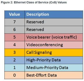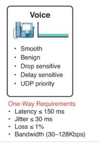 | Voice Traffic Characteristics Voice traffic is benign, meaning it does not consume a lot of network resources. However, voice is very sensitive to delays and dropped packets and it cannot be re-transmitted if lost. Therefore, it must receive a higher priority For example, Cisco products use the RTP port range 16384 to 32767 to prioritize voice traffic. | |