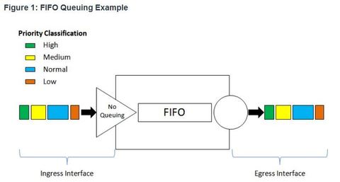 | First In First Out (FIFO) In its simplest form, FIFO queuing—also known as first-come, first-served (FCFS) queuing—involves buffering and forwarding of packets in the order of arrival. FIFO has no concept of priority or classes of traffic and consequently makes no decision about packet priority. There is only one queue, and all packets are treated equally. | |