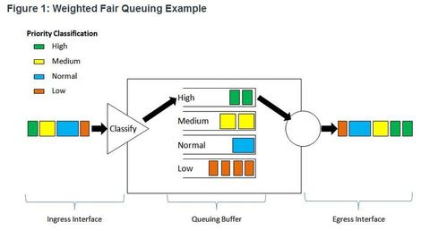 | Weighted Fair Queuing (WFQ) ** WFQ is an automated scheduling method that provides fair bandwidth allocation to all network traffic. WFQ applies priority, or weights, to identified traffic and classifies it into conversations or flows WFQ classifies traffic into different flows based on packet header addressing, including such characteristics as source and destination IP addresses, MAC addresses, port numbers, protocol, and Type of Service (ToS) value. The ToS value in the IP header can be used to classify traffic. | |