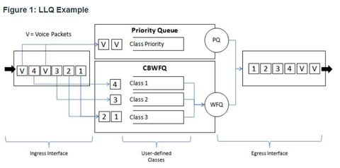 | Low Latency Queuing (LLQ) ** The LLQ feature brings strict priority queuing (PQ) to CBWFQ. Strict PQ allows delay-sensitive data such as voice to be sent before packets in other queues. LLQ provides strict priority queuing for CBWFQ, reducing jitter in voice conversations ** With LLQ, delay-sensitive data is sent first, before packets in other queues are treated. Although it is possible to enqueue various types of real-time traffic to the strict priority queue, Cisco recommends that only voice traffic be directed to it. | |