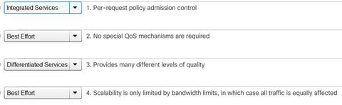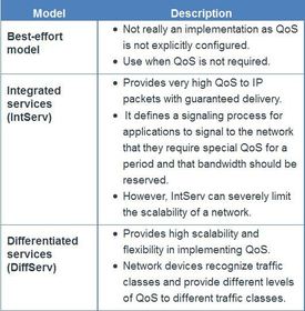 | Selecting an Appropriate QoS Policy Model ** QoS is really implemented in a network using either IntServ or DiffServ. While IntServ provides the highest guarantee of QoS, it is very resource-intensive and therefore limited in scalability. ** In contrast, DiffServ is less resource-intensive and more scalable. The two are sometimes co-deployed in network QoS implementations. Ej: There are three models for implementing QoS: | |