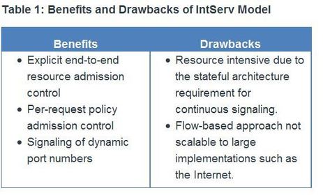 | Integrated Services ** IntServ uses a connection-oriented approach inherited from telephony network design. Each individual communication must explicitly specify its traffic descriptor and requested resources to the network. The edge router performs admission control to ensure that available resources are sufficient in the network. The IntServ standard assumes that routers along a path set and maintain the state for each individual communication. | The network performs admission control based on information from the application and available network resources. The network commits to meeting the QoS requirements of the application as long as the traffic remains within the profile specifications. The network fulfills its commitment by maintaining the per-flow state and then performing packet classification, policing, and intelligent queuing based on that state. |
