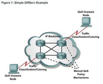 | Differentiated Services ** DiffServ is not an end-to-end QoS strategy because it cannot enforce end-to-end guarantees. However, DiffServ QoS is a more scalable approach to implementing QoS. Unlike IntServ and hard QoS in which the end-hosts signal their QoS needs to the network, DiffServ does not use signaling. Instead, DiffServ uses a “soft QoS” approach. It works on the provisioned-QoS model, where network elements are set up to service multiple classes of traffic each with varying QoS requirements. | |