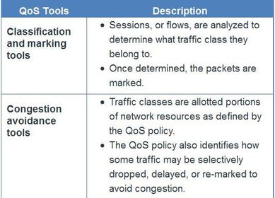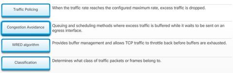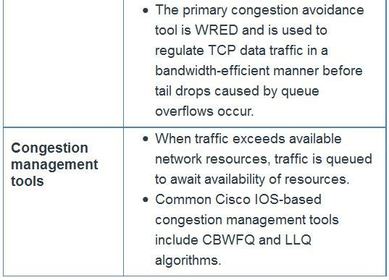 | Congestion Avoidance Congestion management includes queuing and scheduling methods where excess traffic is buffered or queued (and sometimes dropped) while it waits to be sent on an egress interface. Congestion avoidance tools are simpler. They monitor network traffic loads in an effort to anticipate and avoid congestion at common network and internetwork bottlenecks before congestion becomes a problem. Cisco IOS QoS includes weighted random early detection (WRED) as a possible congestion avoidance solution. | ** The WRED algorithm allows for congestion avoidance on network interfaces by providing buffer management and allowing TCP traffic to decrease, or throttle back, before buffers are exhausted. Using WRED helps avoid tail drops and maximizes network use and TCP-based application performance. ** There is no congestion avoidance for User Datagram Protocol (UDP)-based traffic, such as voice traffic. In case of UDP-based traffic, methods such as queuing and compression techniques help to reduce and even prevent UDP packet loss. |