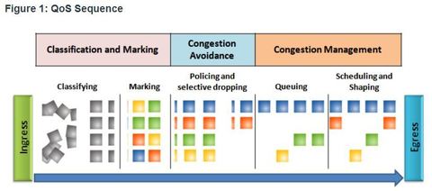 | QoS Tools Ej: ingress packets (gray squares) are classified and their respective IP header is marked (colored squares). To avoid congestion, packets are then allocated resources based on defined policies. Packets are then queued and forwarded out the egress interface based on their defined QoS shaping and policing policy. ** Note: Classification and marking can be done on ingress or egress, whereas other QoS actions such queuing and shaping are usually done on egress | |
