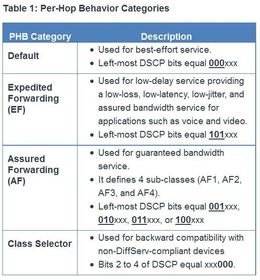 | Marking at Layer 3 When the DiffServ model is used, the packet is marked using 6-bits referred to as the DiffServ Code Point (DSCP) bits. Six bits offers a maximum of 64 possible classes of service. ** DiffServ-aware routers implement per-hop behaviors (PHBs), which define the packet forwarding properties associated with a class of traffic. Specifically, there are four categories of PBH as described in Table | |