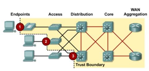 | Trust Boundaries Traffic should be classified and marked as close to its source as technically and administratively feasible - Trusted endpoints have the capabilities and intelligence to mark application traffic to the appropriate Layer 2 CoS and/or Layer 3 DSCP values. Examples of trusted endpoints include IP phones, wireless access points, videoconferencing gateways and systems, IP conferencing stations, and more. - Secure endpoints can have traffic marked at the Layer 2 switch. - Traffic can also be marked at Layer 3 switches / routers. Re-marking of traffic is typically necessary. For example, re-marking CoS values to IP Precedent or DSCP values. | |