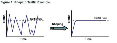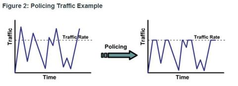 | Shaping and Policing Ej: In contrast, traffic policing propagates bursts. When the traffic rate reaches the configured maximum rate, excess traffic is dropped (or remarked). The result is an output rate that appears as a saw-tooth with crests and troughs ** Queuing is an outbound concept; packets going out an interface get queued and can be shaped. Only policing can be applied to inbound traffic on an interface. | |