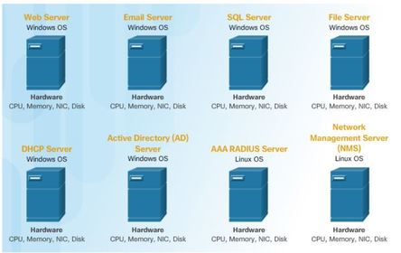 | Dedicated Servers The major problem with this configuration is that when a component fails, the service that is provided by this server becomes unavailable. This is known as a single point of failure. Another problem was that dedicated servers were underused.Dedicated servers often sat idle for long periods of time, waiting until there was a need to deliver the specific service they provide. These servers wasted energy and took up more space than was warranted by their amount of service. This is known as server sprawl. | |